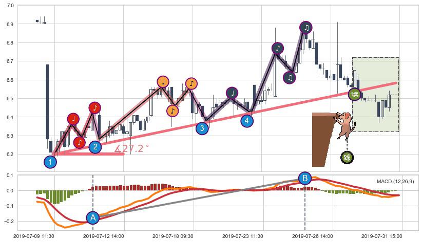 从2019-07-09 11:30至2019-07-26 11:30,共包含79个小时,阶段股价上涨7.42%,阶段股价变动位移路程比: 1 : 6,上涨趋势角度: 27.2