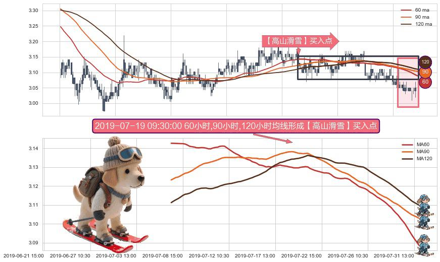 形态多维评估: ⚀ 2019-07-08 09:30:00小时-2019-07-31 15:00:00小时显现 60小时-90小时-120小时均线 【高山滑雪】买入点 看多信号,后市看涨,买入