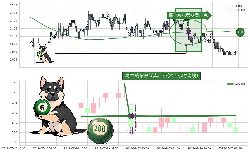 形态多维评估: ⚀ 2019-07-22 09:30:00-小时显现 葛兰威尔均线 200小时均线 第⑥卖出点 走势反转见顶信号,后市看跌,卖出信号