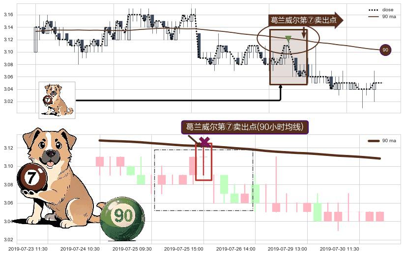 形态多维评估: ⚀ 2019-07-25 15:00:00-小时显现 葛兰威尔均线 90小时均线 第⑦卖出点 下降趋势的中继信号,后市看跌,卖出信号