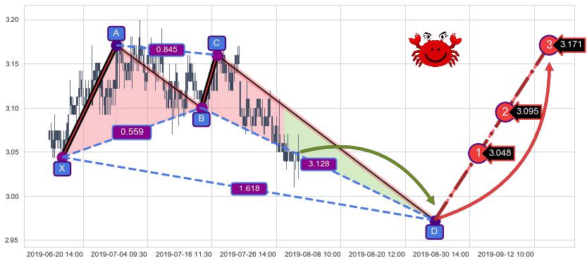 ➢ 距离预测D点位置有足够的下跌空间, 与看涨【螃蟹】形态相反,实际方向【看跌】