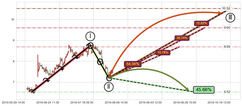 从2019-05-27 14:00至2019-06-18 10:30,共包含88个小时,阶段股价上涨5.87%,阶段股价变动位移路程比: 1 : 9