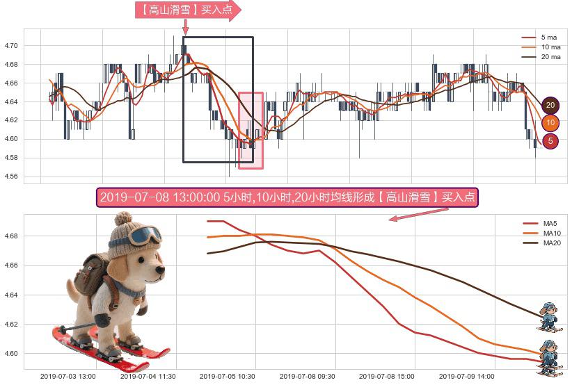 形态多维评估: ⚀ 2019-07-04 14:00:00小时-2019-07-10 10:30:00小时显现 5小时-10小时-20小时均线 【高山滑雪】买入点 看多信号,后市看涨,买入