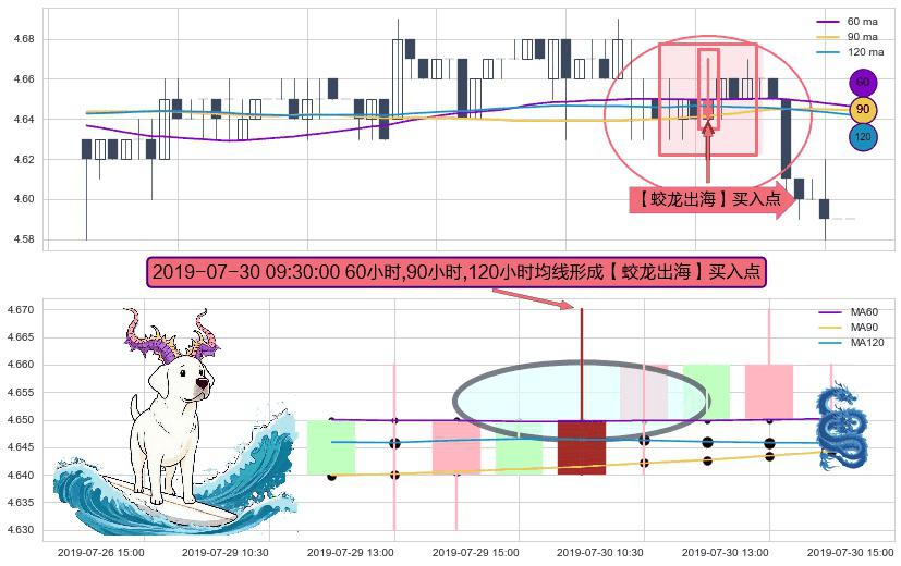 形态多维评估: ⚀ 2019-07-30 09:30:00小时显现 60小时-90小时-120小时均线 【蛟龙出海】买入点 看多信号,后市看涨,买入