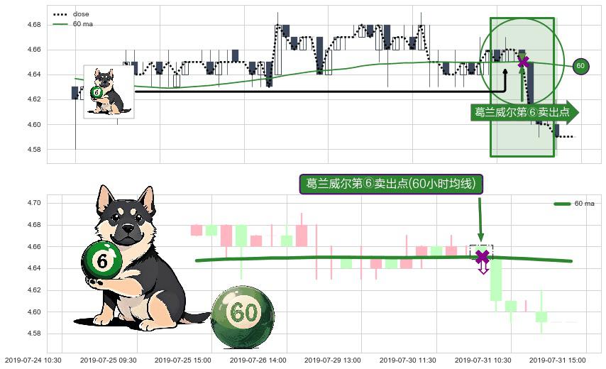 形态多维评估: ⚀ 2019-07-30 15:00:00-小时显现 葛兰威尔均线 60小时均线 第⑥卖出点 走势反转见顶信号,后市看跌,卖出信号