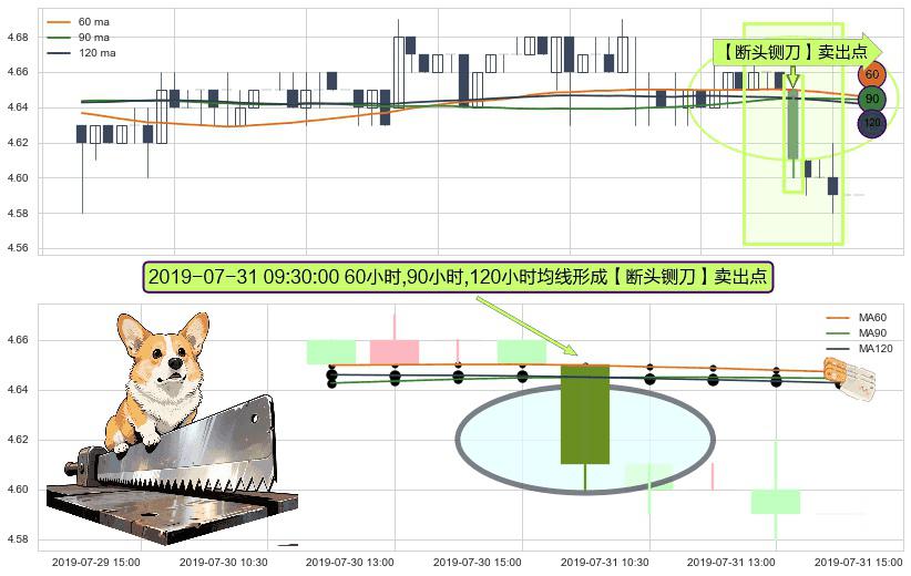 形态多维评估: ⚀ 2019-07-31 09:30:00小时显现 60小时-90小时-120小时均线 【断头铡刀】卖出点 看空信号,后市看跌,卖出