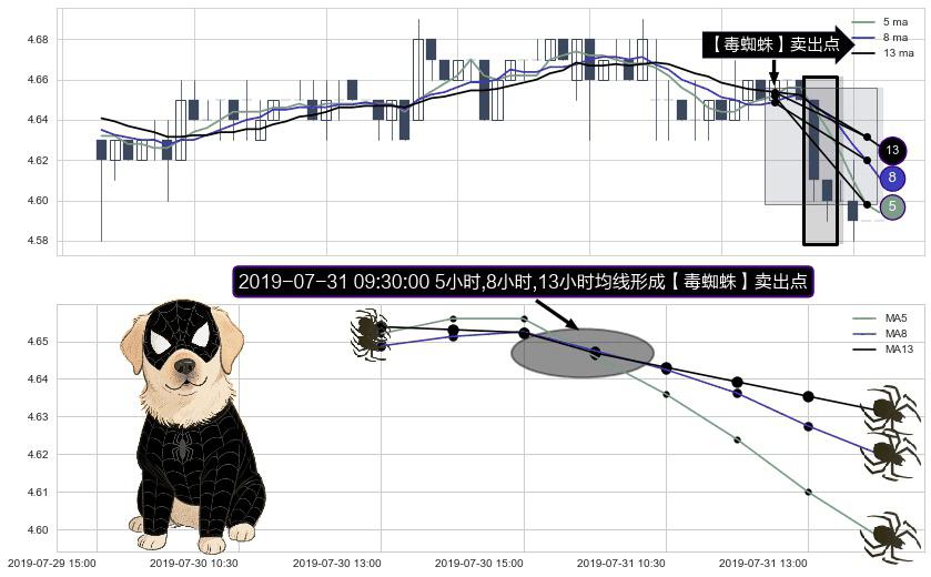 形态多维评估: ⚀ 2019-07-31 09:30:00小时显现 5小时-8小时-13小时均线 【毒蜘蛛】卖出点 看空信号,后市看跌,卖出