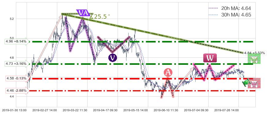 ♘ 支撑价格位4.46,可信任强度72.58%,距离最后交易2019-07-31 15:00形成的收盘价格4.59相差 -2.88%