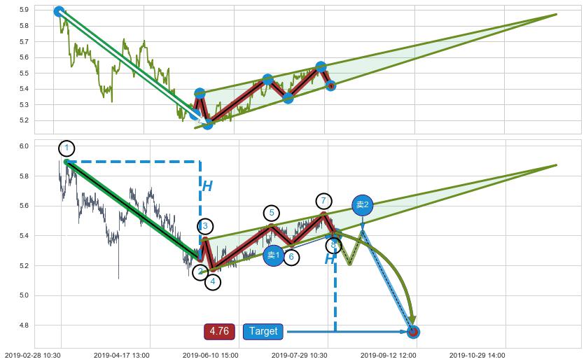 ➢ 升楔型:阻力位【③⑤⑦】不断走高,但对比下边上涨速度慢,构成【楔型】慢线