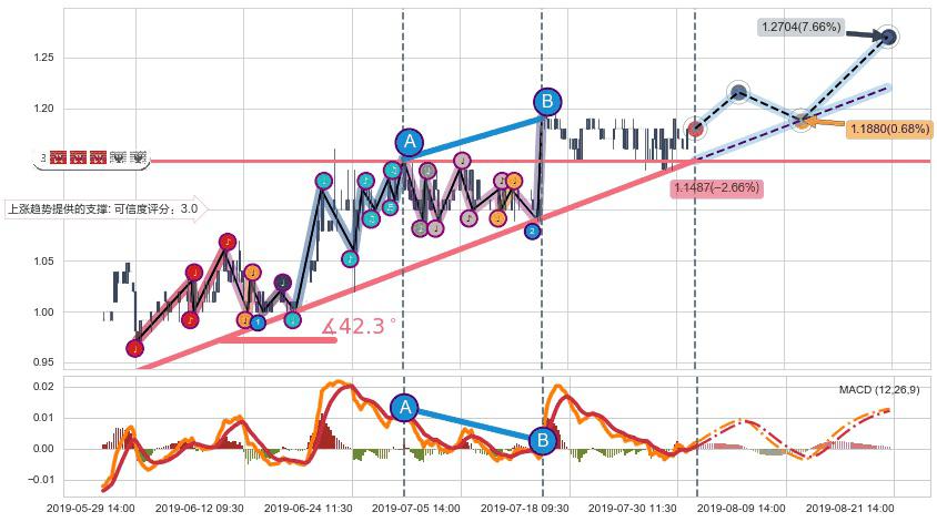 ➢ 预测:2019-08-21 14:00,【继续上扬】稳定目前上涨趋势的前提下,预测价格:1.2704