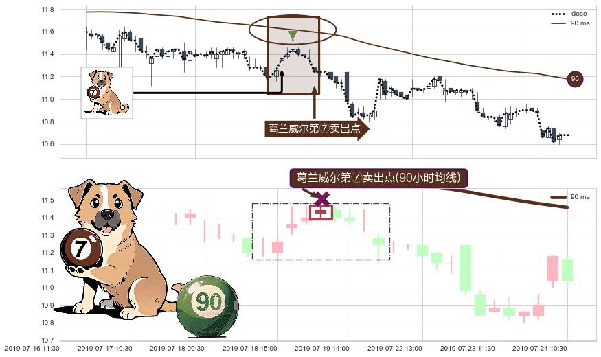 形态多维评估: ⚀ 2019-07-19 11:30:00-小时显现 葛兰威尔均线 90小时均线 第⑦卖出点 下降趋势的中继信号,后市看跌,卖出信号