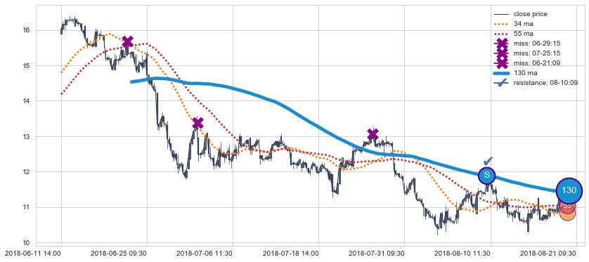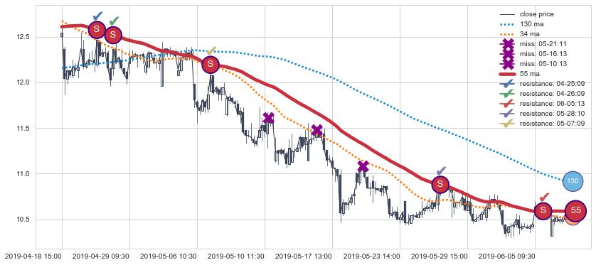 下跌趋势04-18 15:00-06-06 15:00,均线55确认关键阻力5处