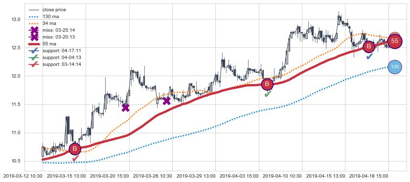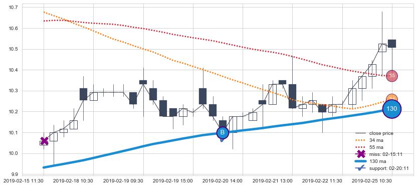 上涨趋势06-06 15:00-07-05 13:00,均线130, 34, 55确认关键支撑3处