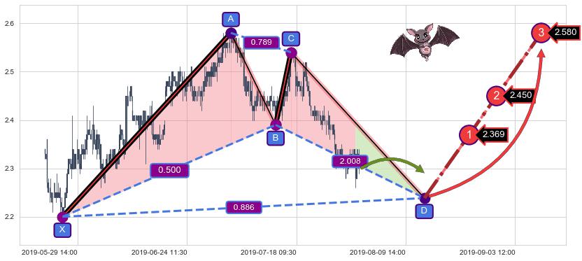 ➢ 接近预测D点位置, 随时警戒看涨【蝙蝠】形态反转启动