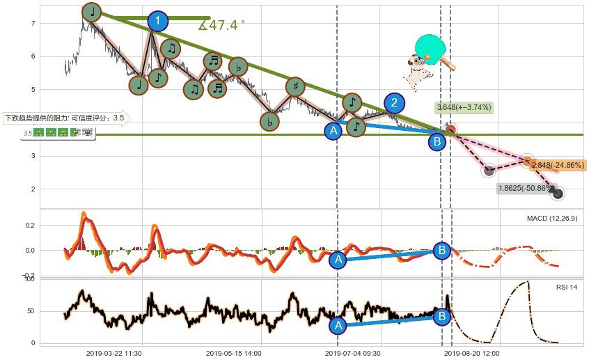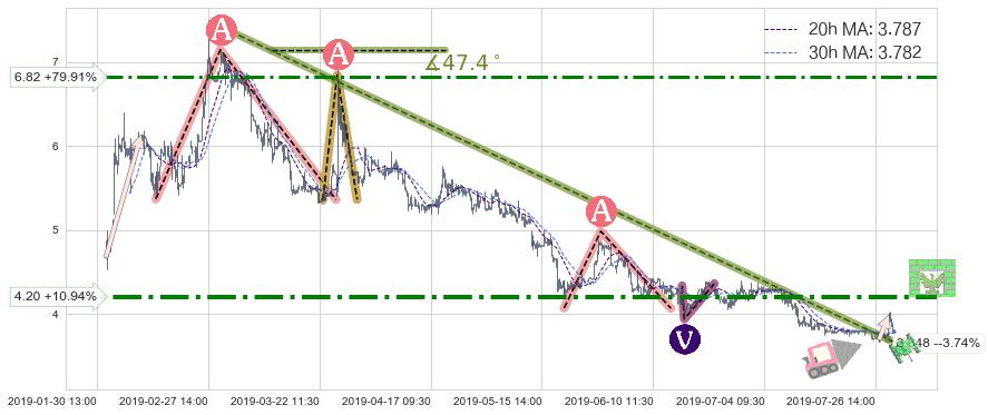 🦴 长线均值回复组合短线趋势跟踪[强阻力信号]2019-03-01 13:00-2019-07-30 13:00下跌趋势依然成立(下跌趋势跟踪依然存在),短线价格略微上行反弹(均值回复猜想),即将接近下跌趋势提供的未破位阻力价格:3.648。