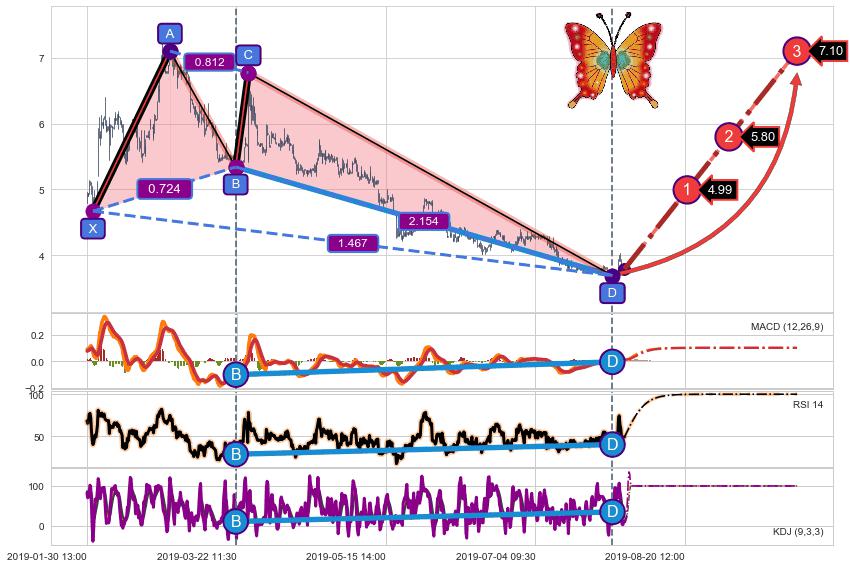 | 4 🅚:【高山滑雪】买入点 ➕ 📡:谐波蝴蝶已到达d点:猜想c下行到达d点后报复性拉升上涨(均值回复) ☞ 看多信号 ⇥ 【均线】交织【图形】⇥ 综合量化分数: 52 | > |