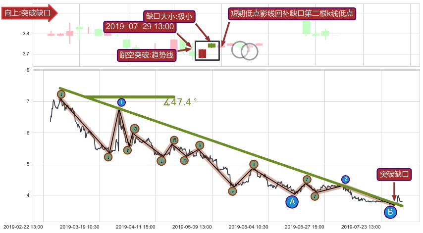从2019-03-01 13:00至2019-07-30 13:00,共包含601个小时,阶段股价下跌-51.32%,阶段股价变动位移路程比: 1 : 10,下跌趋势角度: 47.4