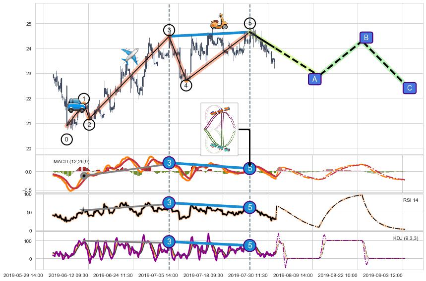 ➢ 1,3,5驱动浪MACD, RSI, KDJ走势都出现【常规背离】反转信号增强