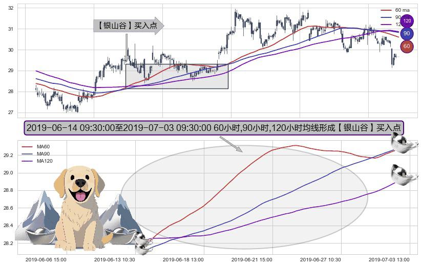 形态多维评估: ⚀ 2019-06-14 10:30:00-小时至2019-07-03 09:30:00-小时显现 60小时-90小时-120小时均线 【银山谷】买入点 看多信号,后市看涨,买入
