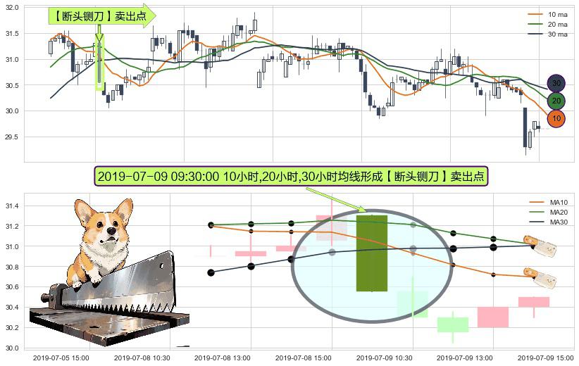 形态多维评估: ⚀ 2019-07-09 09:30:00小时显现 10小时-20小时-30小时均线 【断头铡刀】卖出点 看空信号,后市看跌,卖出