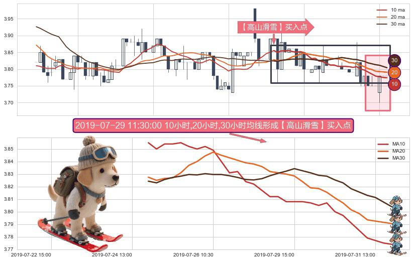 形态多维评估: ⚀ 2019-07-24 15:00:00小时-2019-07-31 15:00:00小时显现 10小时-20小时-30小时均线 【高山滑雪】买入点 看多信号,后市看涨,买入
