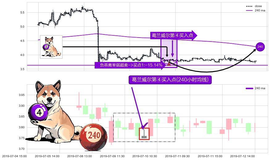 形态多维评估: ⚀ 2019-07-09 15:00:00-小时显现 葛兰威尔均线 240小时均线 第④买入点 下降趋势均值回复的短线反弹信号,后市看涨,买进信号