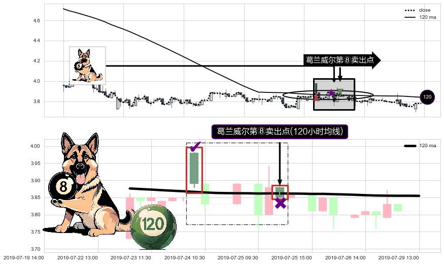 形态多维评估: ⚀ 2019-07-25 11:30:00-小时显现 葛兰威尔均线 120小时均线 第⑧卖出点 下降趋势的中继信号,后市看跌,卖出信号