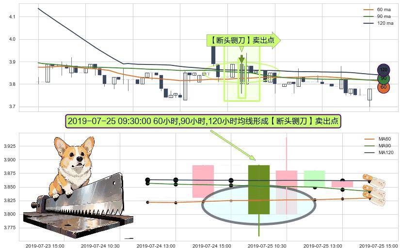 形态多维评估: ⚀ 2019-07-25 09:30:00小时显现 60小时-90小时-120小时均线 【断头铡刀】卖出点 看空信号,后市看跌,卖出