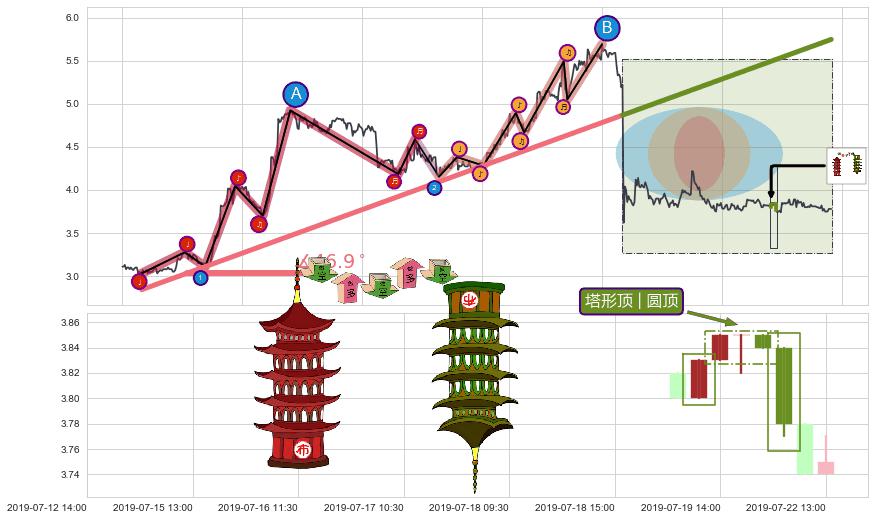 从2019-06-20 09:30至2019-07-24 09:30,共包含139个小时,阶段股价上涨8.98%,阶段股价变动位移路程比: 1 : 14