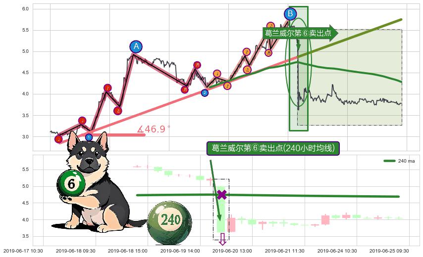 ✂️ 2019-03-11 09:30-2019-06-19 15:00上升趋势存在反转[风险],其原上升趋势的支撑位(5.75)已破位[强阻力信号],原上升趋势角度: 46.9˚