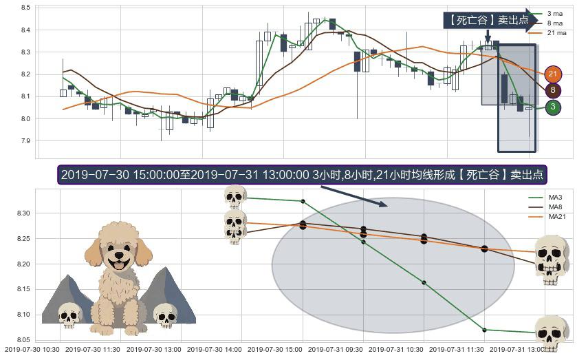 ⚀ 2019-07-31 09:30:00-小时至2019-07-31 13:00:00-小时显现 3小时-8小时-21小时均线 【死亡谷】卖出点 看空信号,后市看跌,卖出