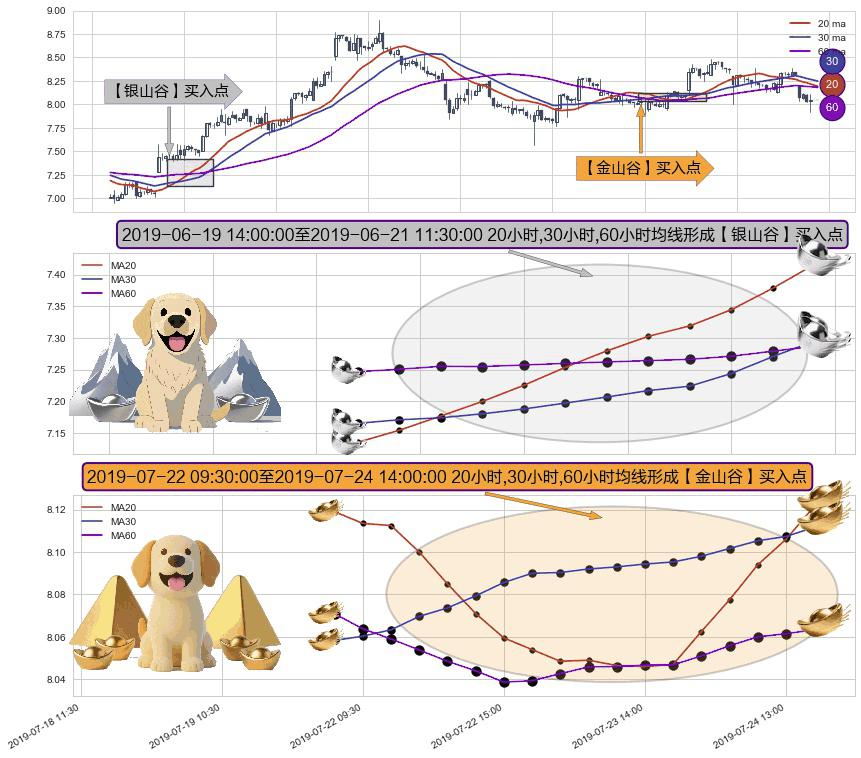 ⚃ 2019-07-22 10:30:00-小时至2019-07-24 14:00:00-小时显现 20小时-30小时-60小时均线 【金山谷】买入点 其再次确认了买入信号,可靠性更强,买入