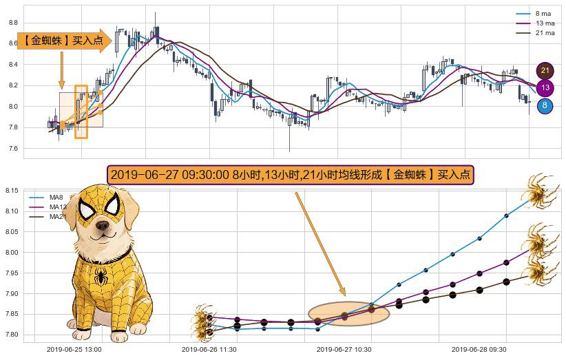 ⚀ 2019-06-27 09:30:00小时显现 8小时-13小时-21小时均线 【金蜘蛛】买入点 看多信号,后市看涨,买入