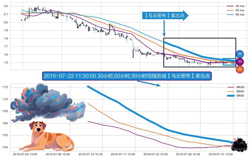 形态多维评估: ⚀ 2019-07-10 14:00:00小时-2019-07-31 15:00:00小时显现 30小时-60小时-90小时均线 【乌云密布】卖出点 看空信号,后市看跌,卖出