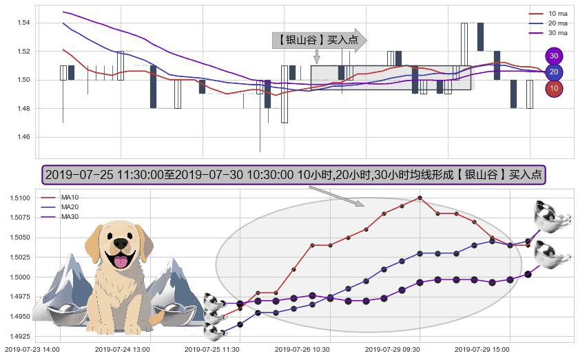 形态多维评估: ⚀ 2019-07-25 13:00:00-小时至2019-07-30 10:30:00-小时显现 10小时-20小时-30小时均线 【银山谷】买入点 看多信号,后市看涨,买入