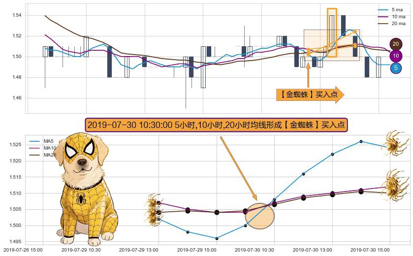 形态多维评估: ⚀ 2019-07-30 10:30:00小时显现 5小时-10小时-20小时均线 【金蜘蛛】买入点 看多信号,后市看涨,买入