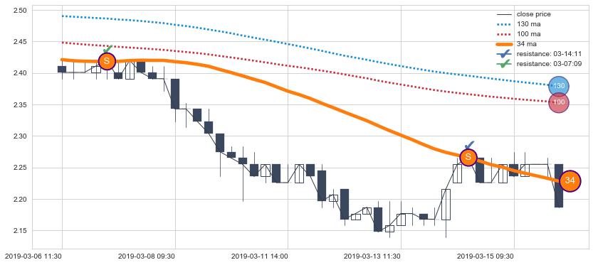 下跌趋势03-06 11:30-03-15 14:00,均线34确认关键阻力2处