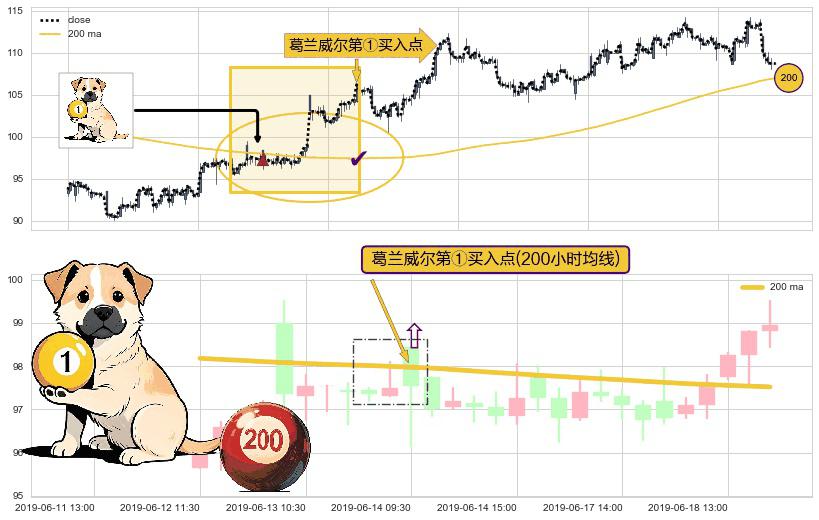 ⚀ 2019-06-14 09:30:00-小时显现 葛兰威尔均线 200小时均线 第买①入点 走势反转见底信号,后市看涨,买进信号