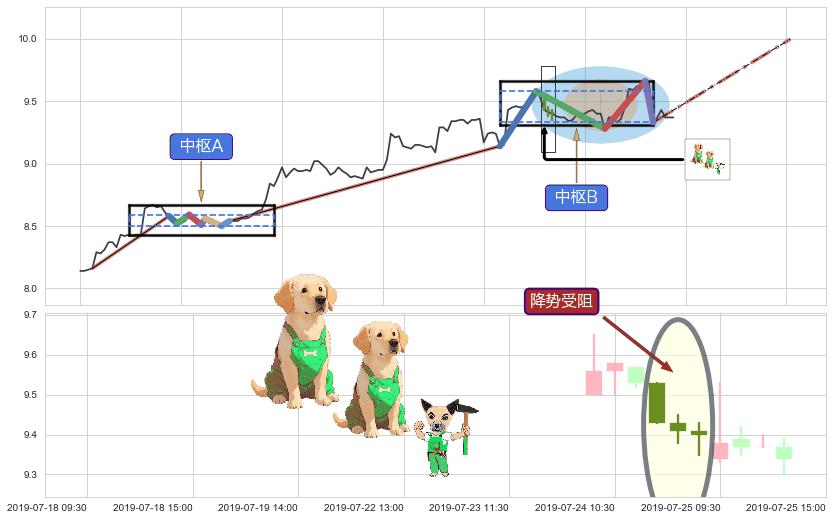 ➢ 【中枢B】:07-22:14-07-31:09,中枢由5笔构成,共39交易小时, ZG=9.58, ZD=9.33