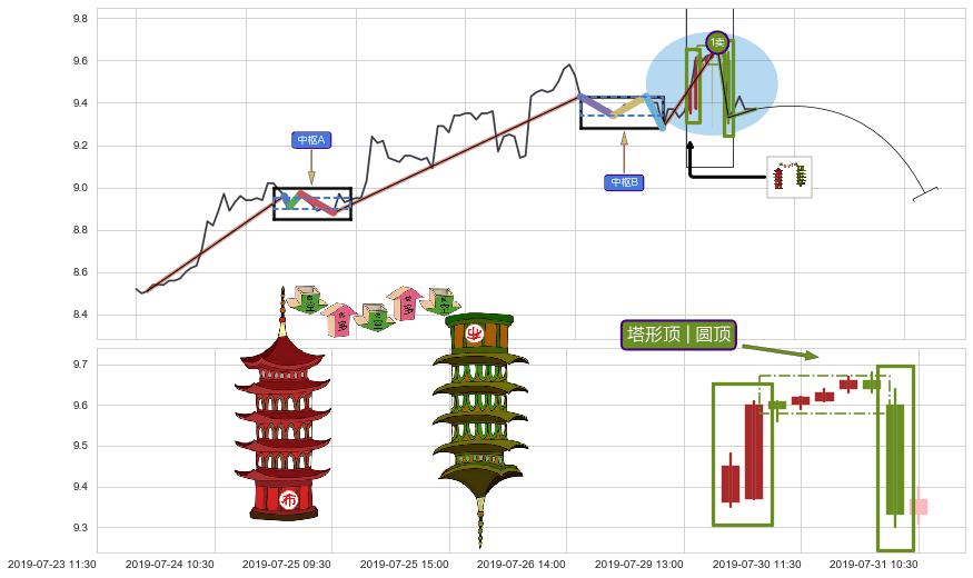 ➣ 【中枢B】:07-24:13-07-29:09,中枢由4笔构成,共16交易小时, ZG=9.43, ZD=9.34
