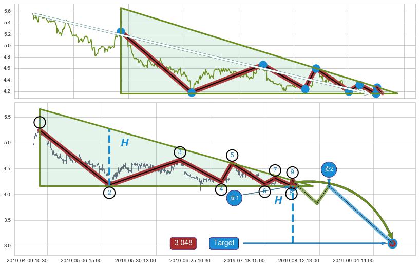➣ 【阻力】空方的卖盘使高点阻力位【③⑤⑦⑨】逐步降低 构成三角的倾斜下降阻力斜边