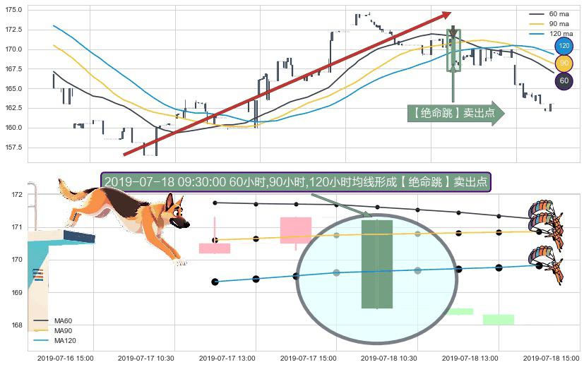 形态多维评估: ⚀ 2019-06-13 14:00:00小时-2019-07-15 15:00:00小时显现 60小时-90小时-120小时均线 【战机起航】卖出点 看空信号,后市看跌,卖出