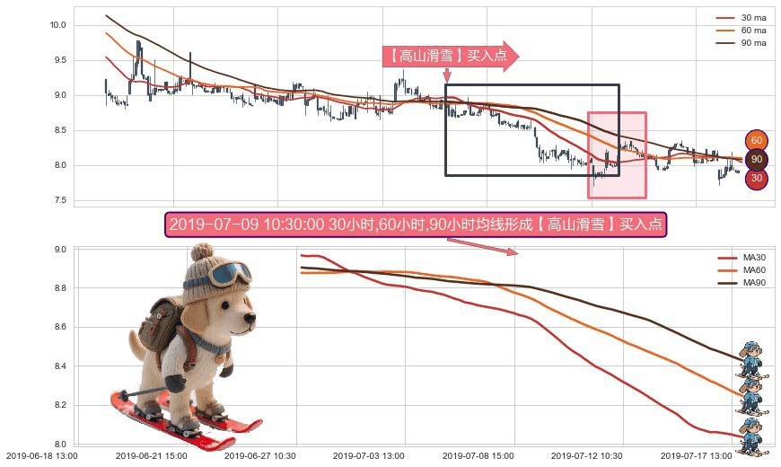 形态多维评估: ⚀ 2019-06-27 11:30:00小时-2019-07-17 15:00:00小时显现 30小时-60小时-90小时均线 【高山滑雪】买入点 看多信号,后市看涨,买入