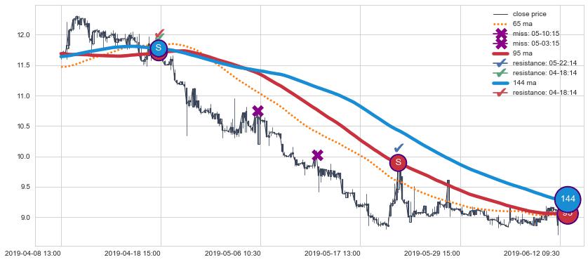 下跌趋势04-08 13:00-06-12 09:30,均线144, 95确认关键阻力2处