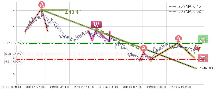 ♘ 阻力价格位6.95,可信任强度89.44%,距离最后交易2019-07-31 15:00形成的收盘价格6.39相差 +8.73%
