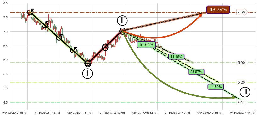 ♘ 支撑价格位5.91,可信任强度74.52%,距离最后交易2019-07-31 15:00形成的收盘价格6.39相差 -7.50%