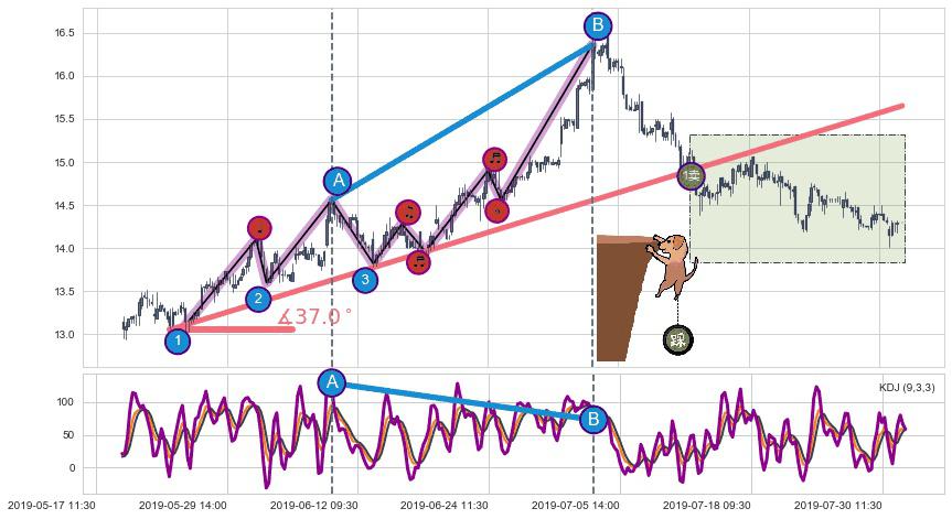 ✂️ 2019-05-24 09:30-2019-07-09 10:30上升趋势存在反转[风险],其原上升趋势的支撑位(15.65)已破位[强阻力信号],原上升趋势角度: 37.0˚