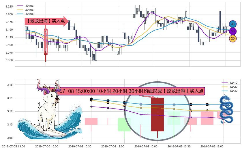 形态多维评估: ⚀ 2019-07-08 15:00:00小时显现 10小时-20小时-30小时均线 【蛟龙出海】买入点 看多信号,后市看涨,买入