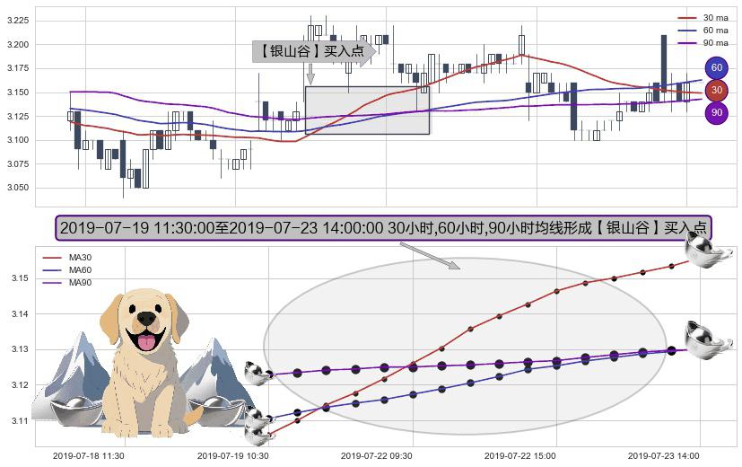 形态多维评估: ⚀ 2019-07-19 13:00:00-小时至2019-07-23 14:00:00-小时显现 30小时-60小时-90小时均线 【银山谷】买入点 看多信号,后市看涨,买入