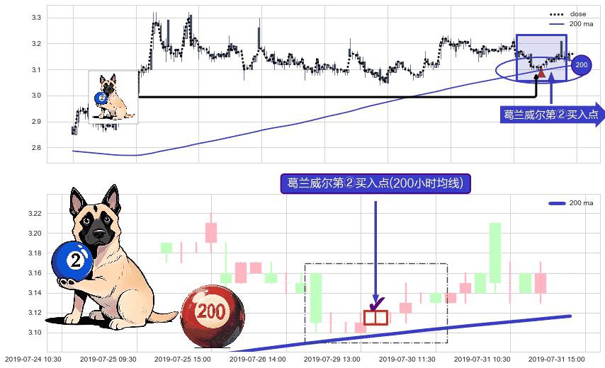 形态多维评估: ⚀ 2019-07-29 14:00:00-小时显现 葛兰威尔均线 200小时均线 第②买入点 上升趋势的中继信号,后市看涨,买进信号